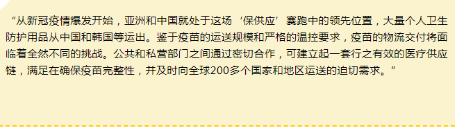 在政府积极的疫情防控举措、精准政策支持下,我国不仅在经济方面率先克服疫情带来的影响,在疫苗研发方面也处于全球领先地位。DHL国际快递公司凭借高质量、合规的物流和供应链整体解决方案,目前已与国内疫苗生产企业展开接触,其中部分业务开发也已进入到实质性阶段,包括包材测试,危险品管理等相关事宜,以及为疫苗生产企业提供出口疫苗批文、包装和相关认证,以及出口航线设计等方面的支持。